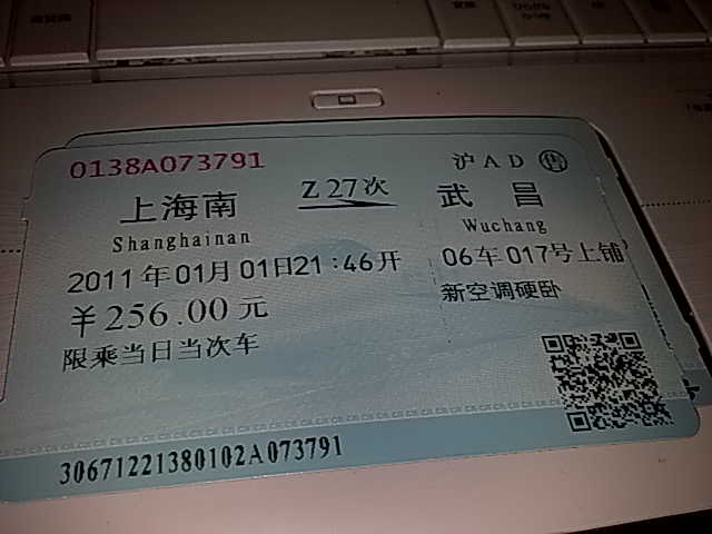 1/3の漢口発上海虹橋行き動車組(新幹線のこと)の切符を購入した。